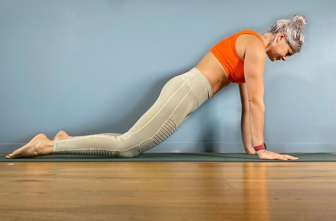 呼气,微微收核心,屈手肘向下