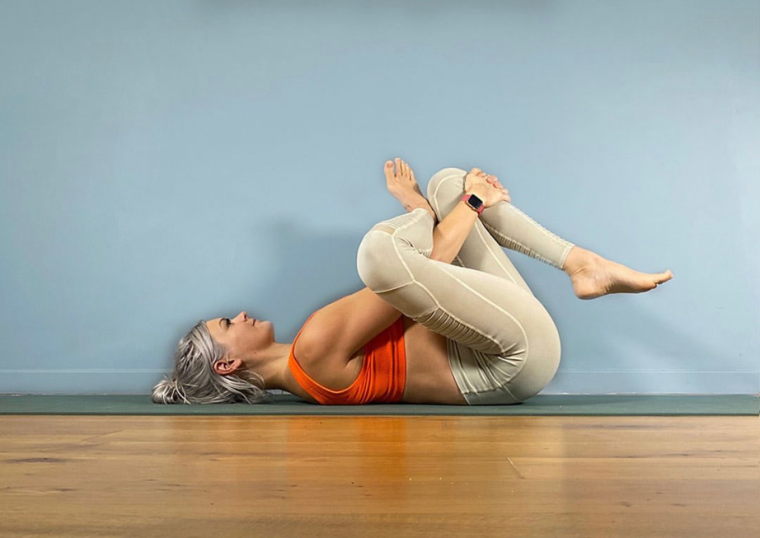 仰卧在垫面上,屈双膝靠近腹部