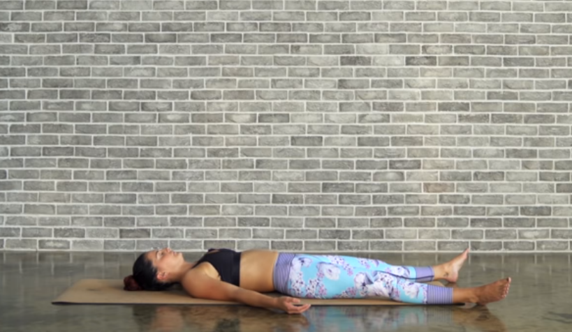 仰卧在垫面上,屈右膝