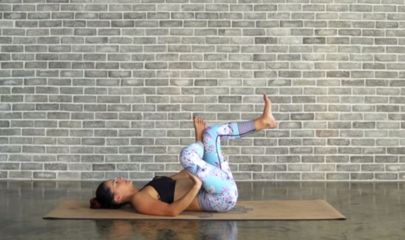 呼气,屈右膝靠近腹部