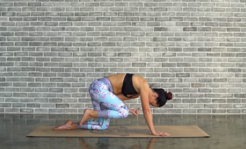 最后抬起头部,呼气,转动骨盆向后
